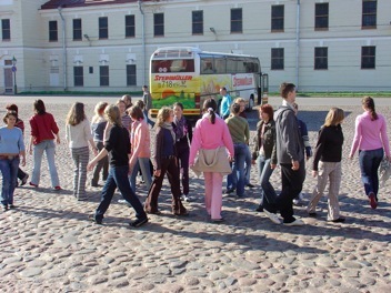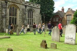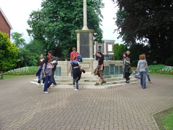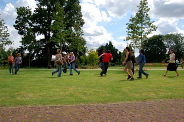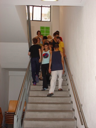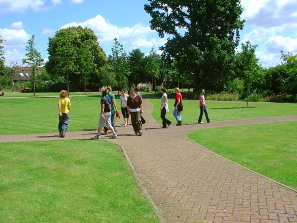 Flock was a simplification of ensemble performances such as And, Here and There and Pieces of People. The performers try to match their speed and their distance from one another as they walk or run. No one leads as the group meanders and drifts around a town or through buildings. The group can spread very thinly, with everyone running in every direction, or it can contract into a tight seething mass. The group is particularly alert to thresholds and boundaries. If one performer crosses a symbolic barrier, such as a divide between a path and a lawn, the others will copy, which will start a trend that will lead to the group occupying a new area. The group as a collective entity interacts with its environment in this way.