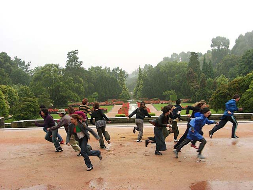 Here and There was was designed in response to the extraordinary house and formal gardens at Serralves. It was performed by an international group of young artists as part of a residency with the arts organisation Mugatxoan. The audience/spectators walked through the grounds, saw the performers in the distance amongst the trees or partially glimpsed them as they interacted with each other or responded to features in the garden before thy continued the performance in the house. There were distinct phases triggered within the group. They formed a cohesive unit that was often scattered and partially hidden.