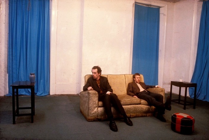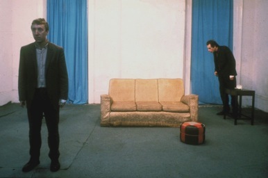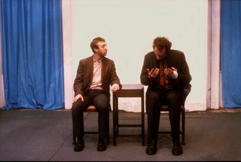 Two men sit side by side uncomfortably close. There is a sense of doubling, together with an intimate and indeterminate relationship, reminiscent of a comedy double-act. One of the men listens intently while the other carefully describes a simple but imaginary act, as if he is following the action as it happens. An imaginary glass is passed to the other man who cups his empty hand to take and hold it, but the imagined action ends in failure. There is an awkward silence as the man, lifts his empty, cupped hand to regard his trousers and the imaginary spillage.
