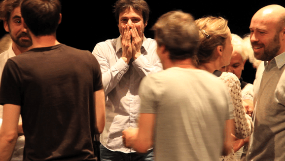 One of Us is a live ensemble performance made up of a mixed group of 12 to 14 performers. It was first performed in 2014 in France as L’Un de Nous with a core group of professional actors and local volunteers. It was radically reworked in 2018 as Uno di Noi in Italy, with experienced actors and dancers from throughout Italy. Although English is spoken through the developmental process, the performers speak in their native language during the performance, so one or several languages may be spoken depending on the constitution of the group. The performance is in the round with the performers moving in and out of the space from all sides. It is adaptable to the site and situation – it was performed in a black box theatre in L’Avant Seine and outside in the courtyard at Villa Nappi in Polverigi – but most of all the material is drawn from the performers’ own memories and stories, so it is very responsive to the constitution of the group.