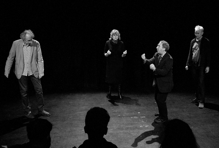 The performance was a response to the research in conversational analysis conducted at Loughborough University, where interactions are broken down and transcribed. Four performers piece together the opening scene from a Laurel and Hardy short film, Hogwild. They rehearse and demonstrate the action and speech in close detail.They learn from each other, correcting and refining each part as they practice the gestures and manner of the delivery. The performers play all the parts as well as describing the placement of furniture and the position of the people in the scene on the empty stage. There is no reference to the source material or the iconic characters during the performance.