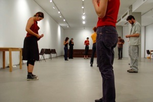 The group sits resting their heads against the walls of the gallery as if they were asleep but they are alert to each others’ movements and roll their heads to glance around the room. They stand together and find a place on the floor away from the others. They occupy themselves with some small activity but are acutely aware of being observed. A performer tries to approach another but as they get near he collapses to the floor and plays dead.