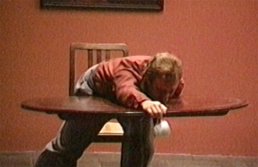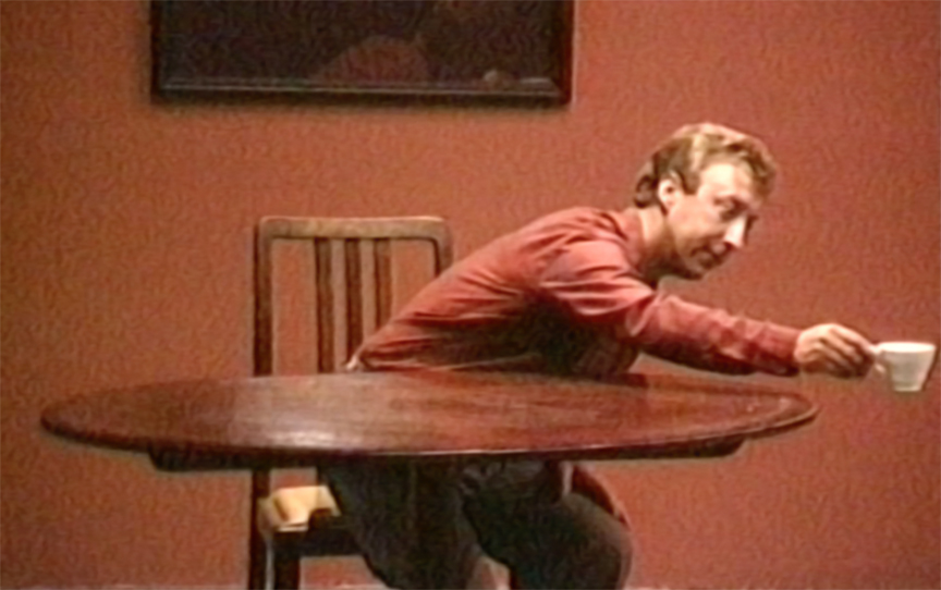 A performer rehearses carrying plates from one table to another. Plates fall from his hands midway and smash on the floor. A pile of crockery survives the journey and is laid out on the table. Cups are knocked over in clumsy fitful movements but in a strict sequence. The fragility of the ceramic objects becomes an obsessional interest. The performer manages to smash all the item of crockery except for one. Only a vase remains intact, spinning around on the tabletop.